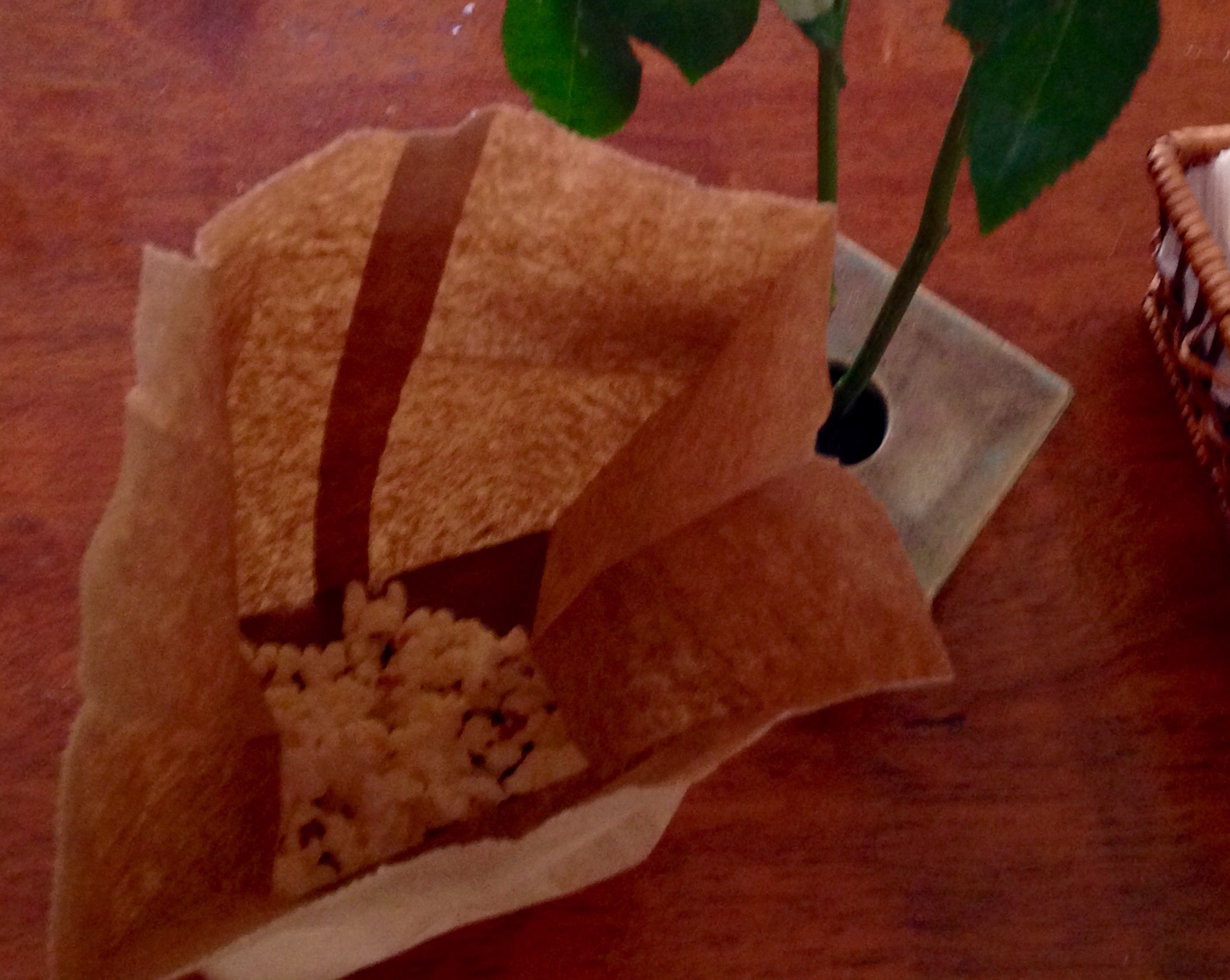 Handful of popcorn: Microwaved plain popcorn kernels in a brown paper bag. (Thank you Anthony & Cathy!). Tasty treat without salt or oils.