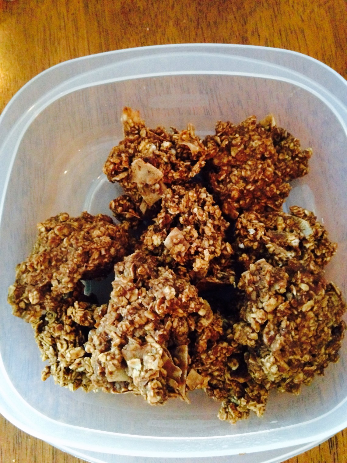 Apple plus baked my own banana-coconut-oatmeal-cocoa bites. They were ok. Think I need to add more banana next time: