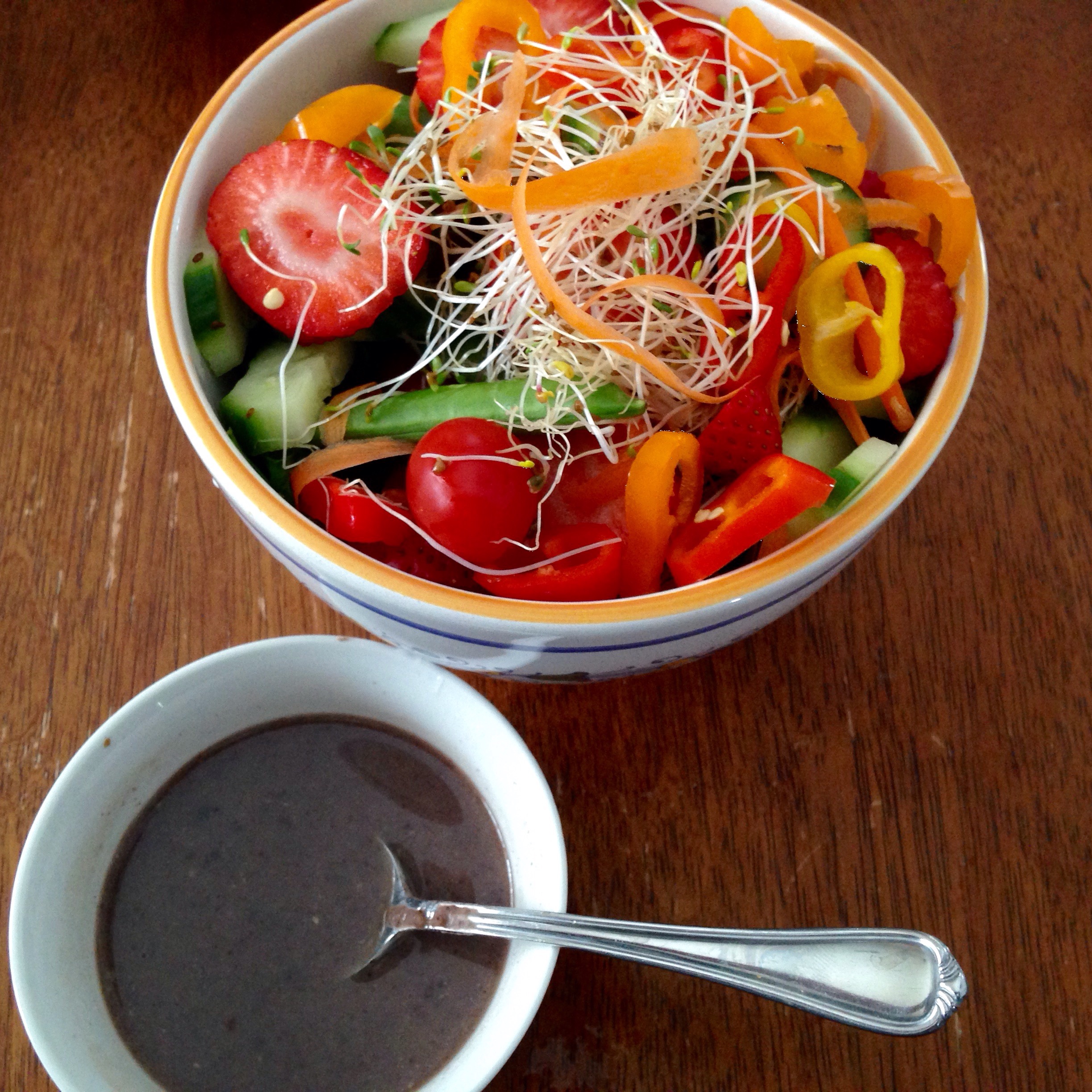 Remember the bean dip I made yesterday? Well, it turned out to be a great base for a salad dressing. I combined a couple of tablespoons of it in with a little fresh pineapple juice and rice vinegar. The idea was inspired by a kick-ass dressing my coach made for the Pro-Activity Plant Based Diet program members to try. “I love it when a plan comes together” – Mr. T