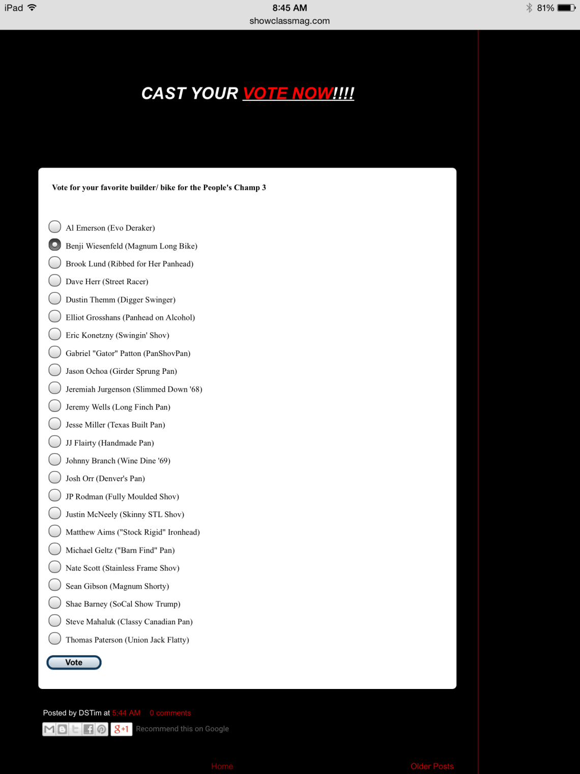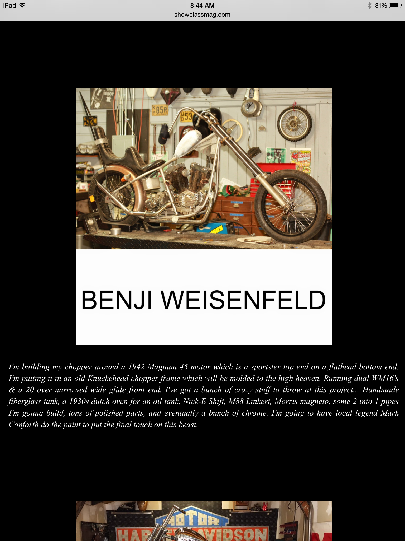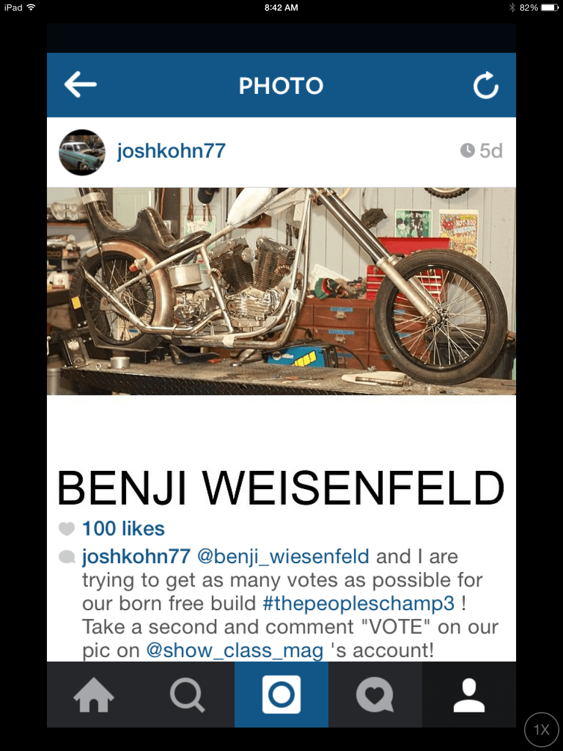 A little tardy with yesterday’s entry – late night. Attended an election party for my friend Josh’s entry in the People’s Champ- Showclass Magazine motorcycle build contest. Please take a minute and VOTE for Benji Weisenfeld on Instagram and on showclassmag.com: