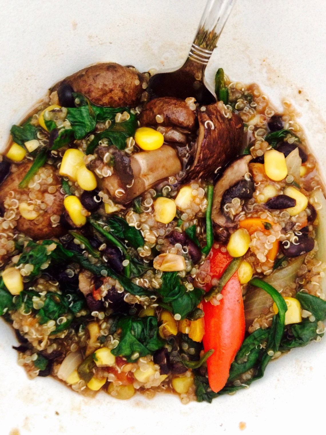 Steamed quinoa, portobello mushrooms, onions, peppers, spinach, black beans, corn and seasoned with an Adobe-ole blend. I added in the leftover Tomatoe veggie soup from The Fuel Good Cafe. Very tasty and satisfying: