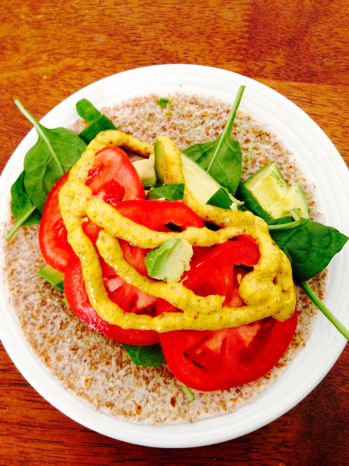 Enjoyed a veggie wrap for lunch with mustard (bean sprout wrap):