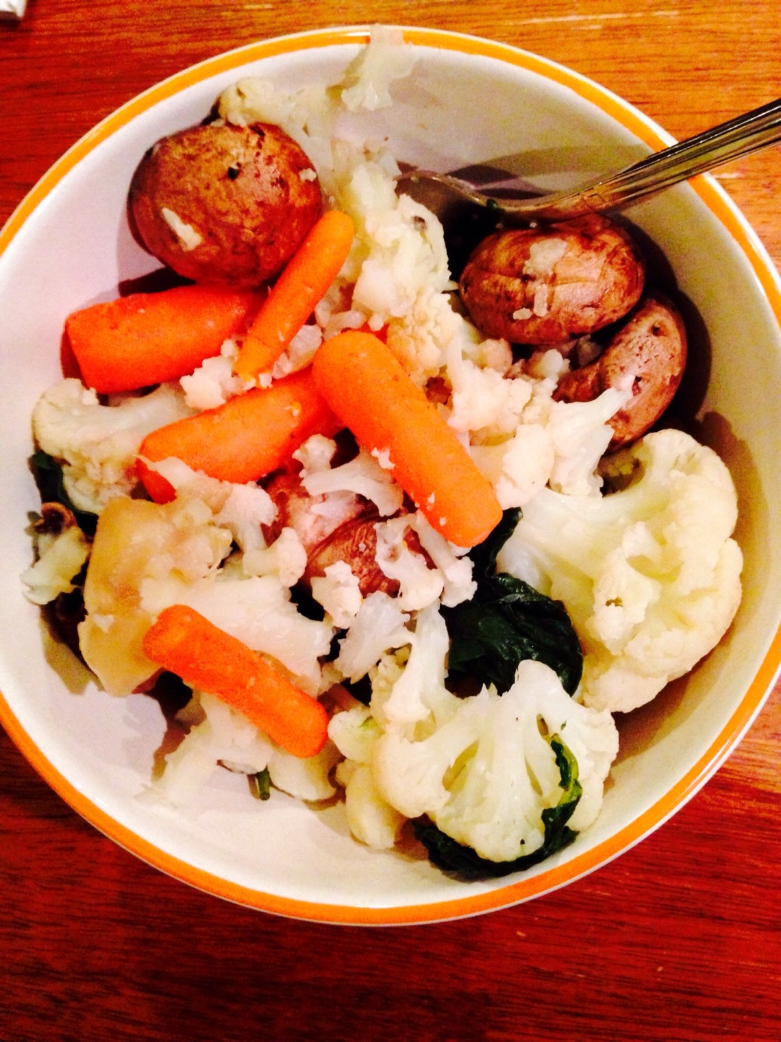 Wanted to make the lentil Shephard pie for dinner but ran out of time – took my daughter to see Cinderella after school (very cute). Instead, I made a bowl of steamed mushrooms, spinach, carrots, cauliflower, flax seed, brown rice, red quinoa, black lentils and whole wheat pearled couscous: