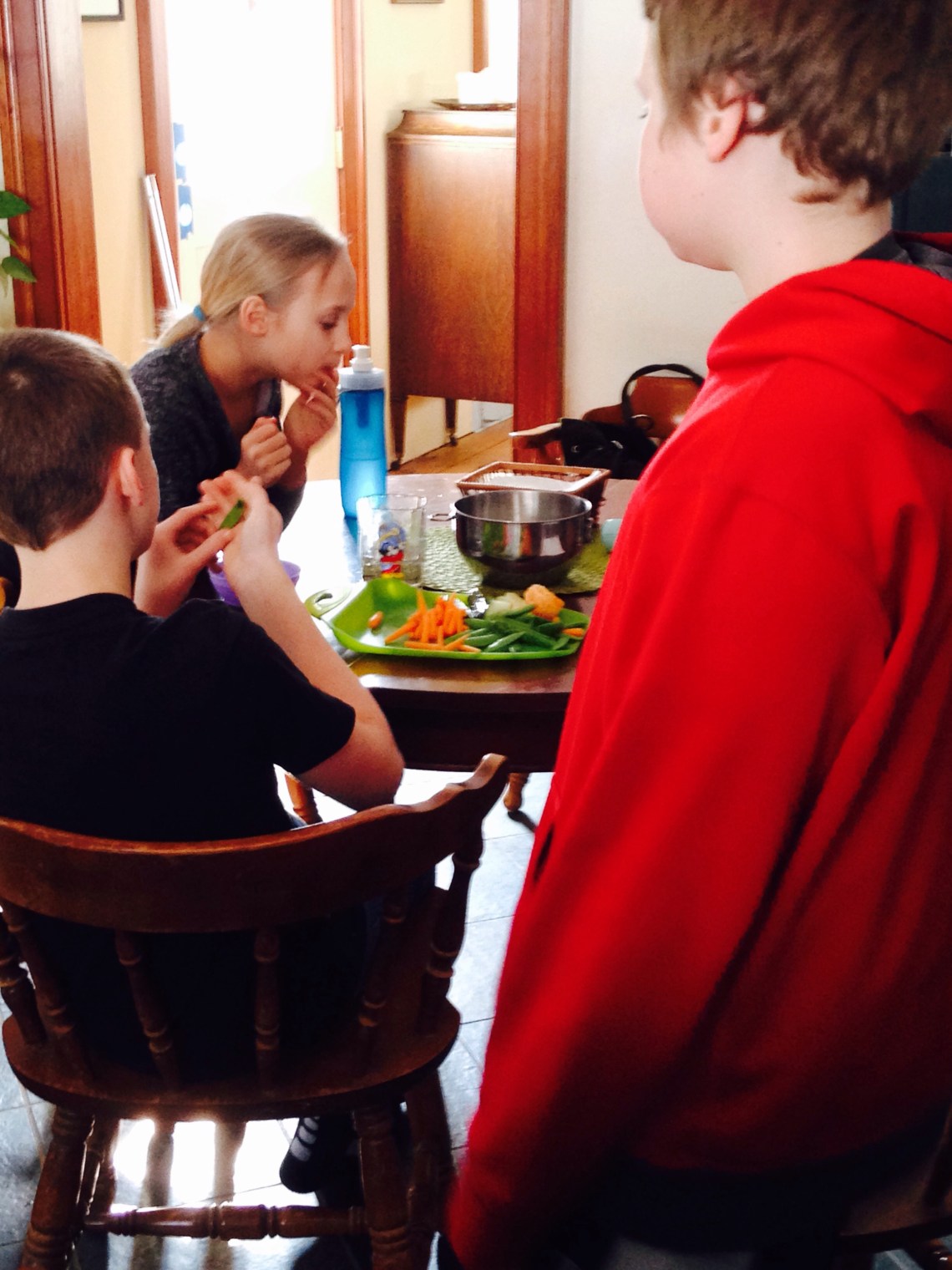 Ordered pizza tonight for the family but snacked on carrots and snap peas. Had some wine with our neighbor and noticed to my coaches point that if you put out veggies they wil magically disappear: