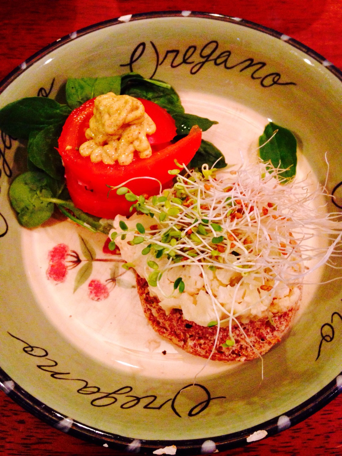 Dinner consisted of a thick slice of a roasted cauliflower head drizzled with left over vegan Alfredo sauce on a food for life sprouted English Muffin, topped with tomatoe, spinach, bean sprouts and mustard. I had a side of a sweet potatoe and a crunchy dill pickle: