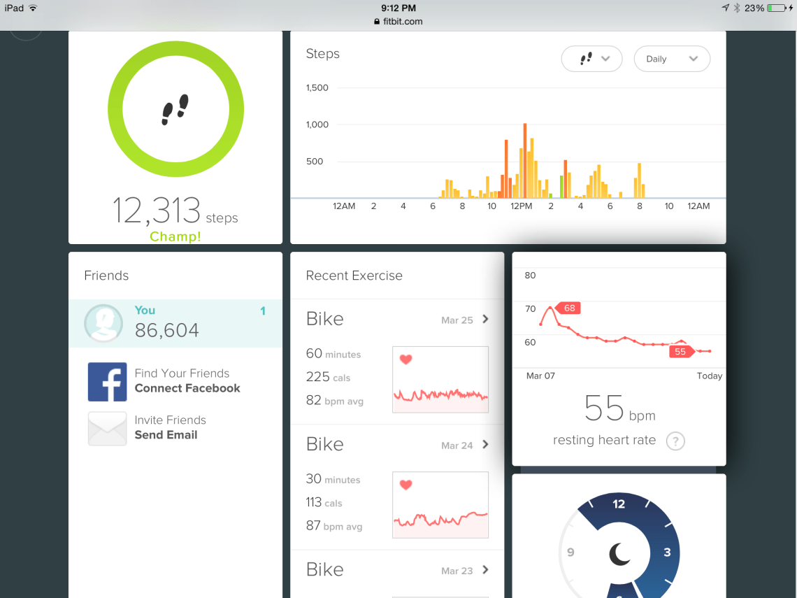 Also trying to ramp up on my move minutes. Got in an hour of spinning – trying real hard to keep within the “fat burn” zone. The Fitbit has been real useful for HR monitoring and keeping me moving in general. This is what I looked like today: