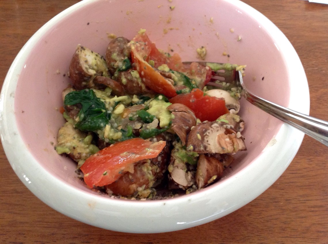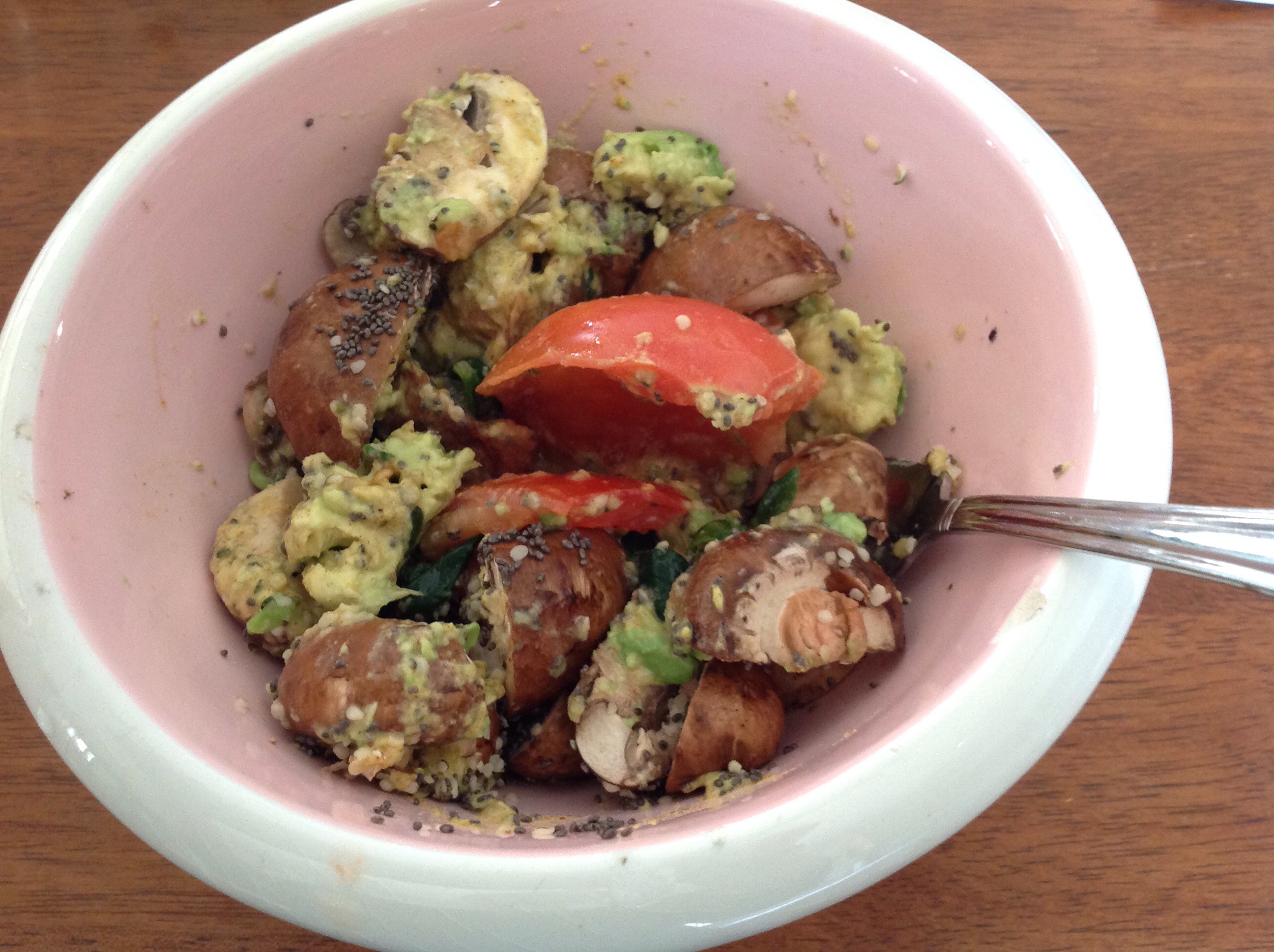 Fridge looking empty, bottom of the barrel. Had a sprouted English muffin with almond butter, fruit, and a cup of green tea for breakfast. When lunchtime rolled around, I was able to scrap up some mushrooms, tomatoes, spinach, avacodo, hemp and chia seeds. I mashed up the avacodo, mixed in some mustard and tossed with my veggies. It was good: