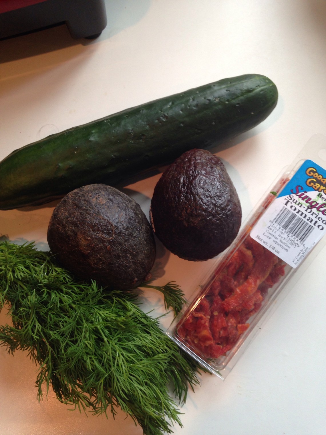 I let the lentils soak and then put them in with the quinoa in my rice steamer. While the quinoa/lentils were steaming, I diced up my veggies and herbs + made a creamy cucumber, avocado, sun dried tomatoe, dill, date and almond dressing in my fancy new blender.