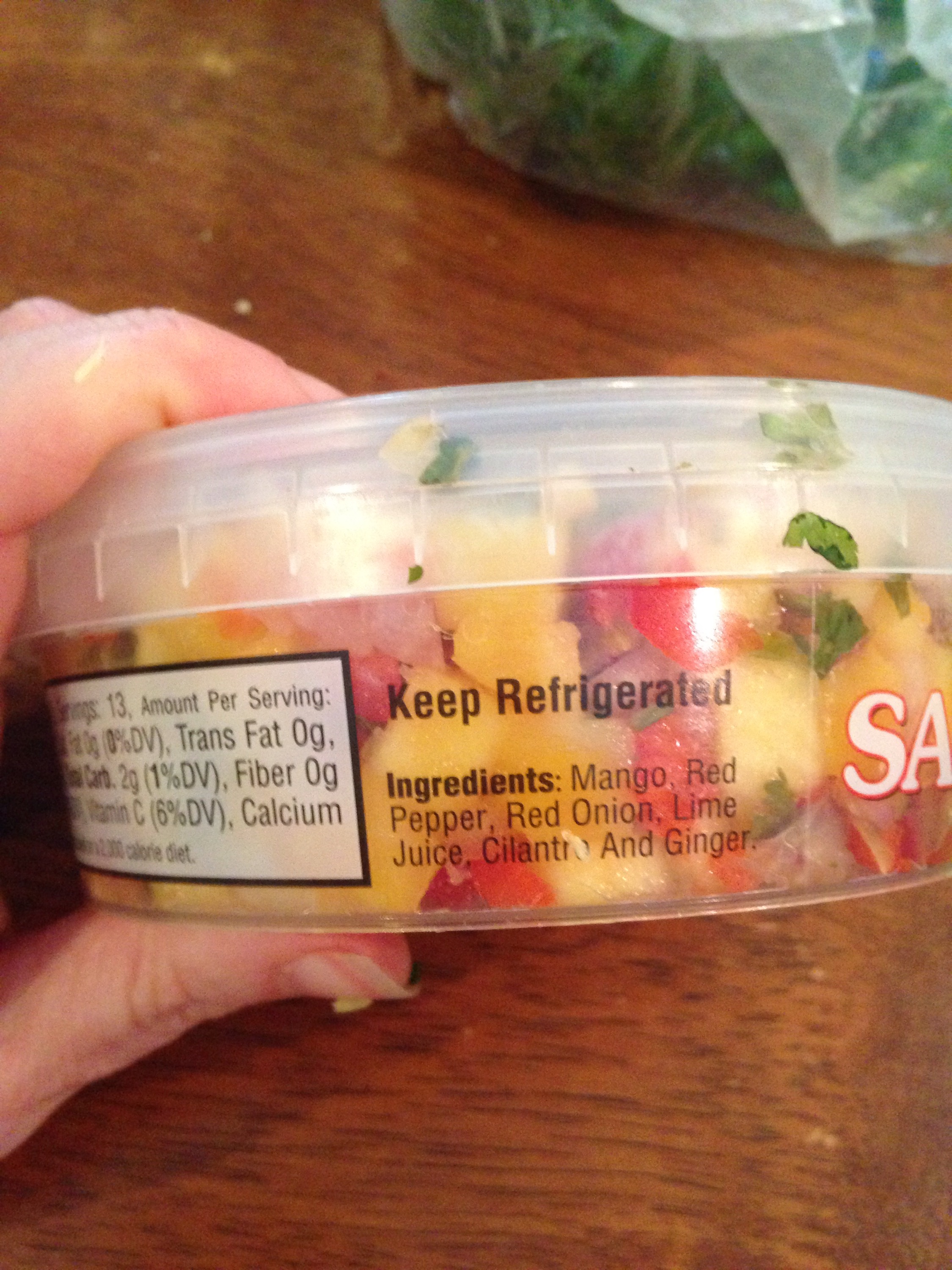 That is a total of 22 wholesome and healthy ingredients. Of the 22 ingredients, 6 were puréed into a silky smooth & creamy dressing that I mixed into the salad (avacoda, dill, sun dried tomatoes, cucumber, dates, almonds). I purchased some mangos that did not seem ripe enough plus a back up batch of fresh mango salsa just in case. I ended up using the back up batch of fresh made mango salsa: