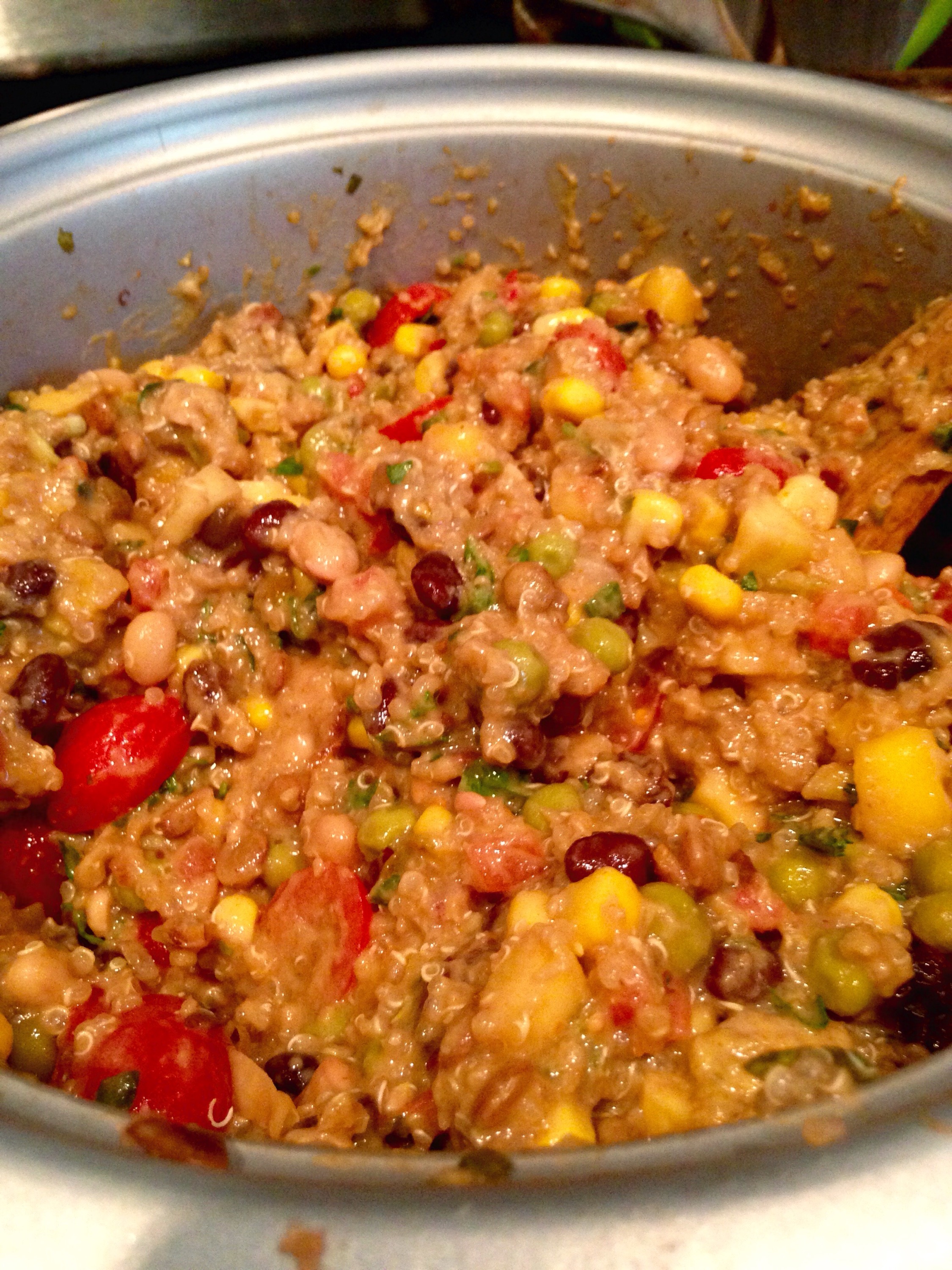 I mixed all of this together along with my mango salsa, canned beans, peas, corn, raisins, seeds and lime juice. Can be served at room temp or chilled.